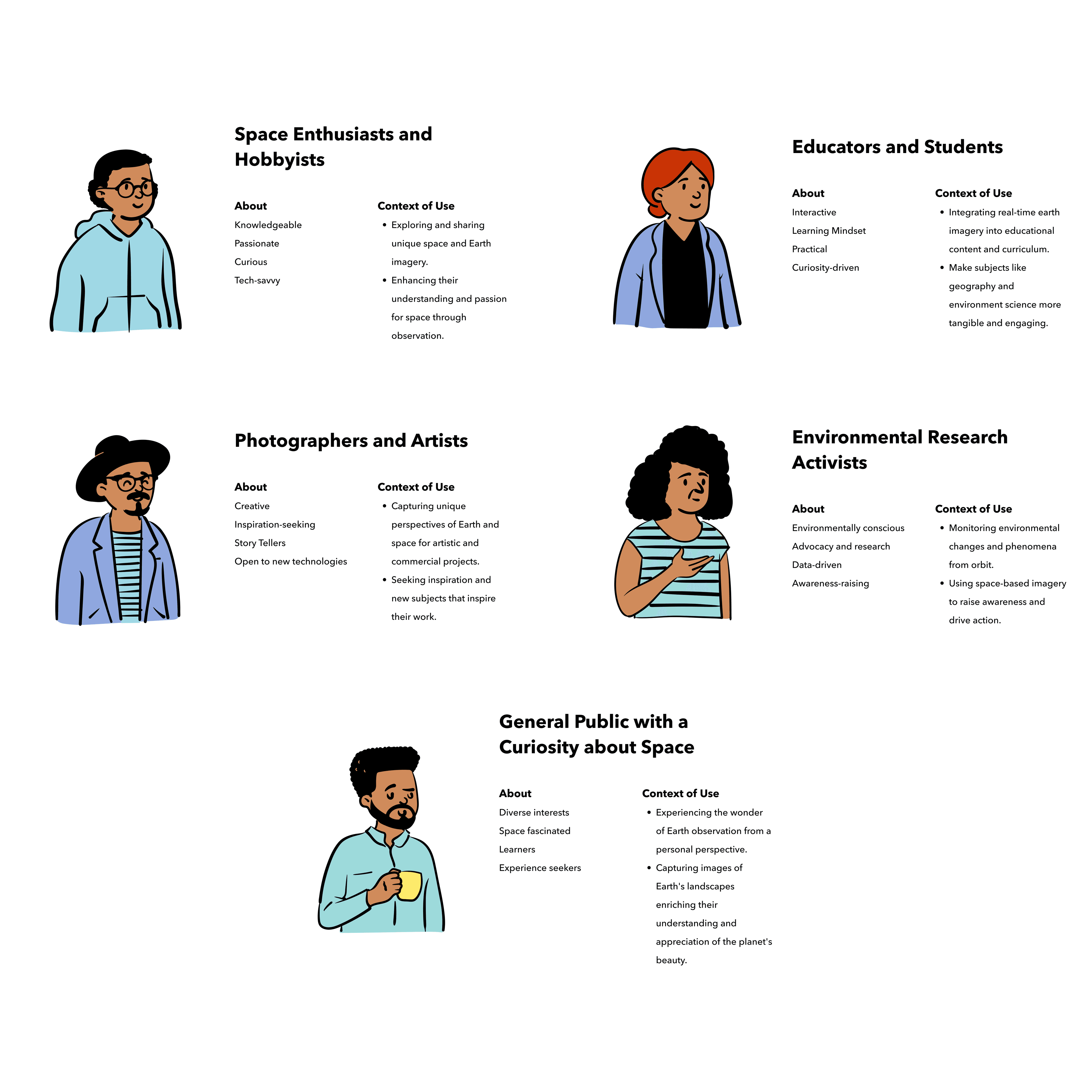 Based on-ground research and speaking to a lot of space enthusiasts I got an idea of our possible users and their context of use